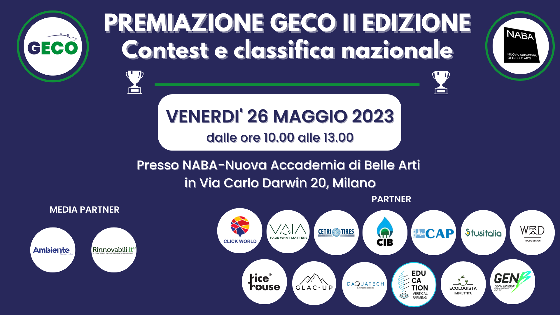 Durante l’evento saranno presenti i partner dell’iniziativa che consegneranno i premi agli studenti e classi vincitrici oltre al team di GECO con il suo ideatore Daniele Capogna e il suo comitato scientifico. Farà gli onori di casa Stefano Saviozzi, Domestic Enrollment Manager di NABA.